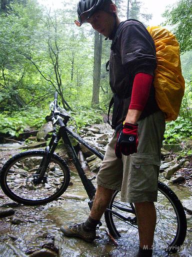 | Kompletnie zmoczeni, przeprawiamy się przez śmiertelnie niebezpieczny... strumyk górski, gdzie woda podniosła się podczas opadów aż do... kostek. | |